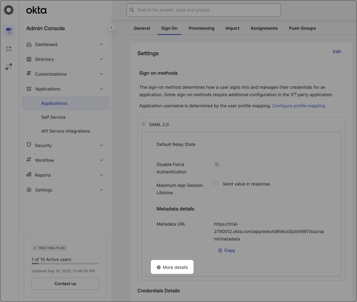 - Entity ID / Issuer - Copy and paste the Issuer value from Okta