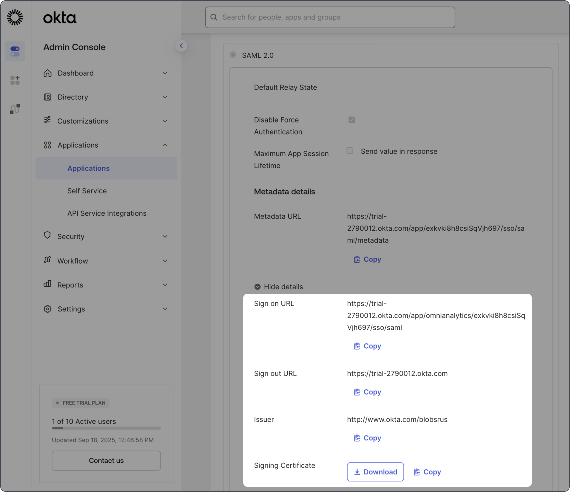 - Certificate - Use the Copy button next to the Certificate field in Okta, then paste the contents in Omni.