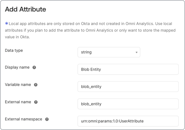 - Defining attribute values. When you do this, use the user profile attribute you created in Okta in step 2. The mapping between this attribute and the one in the Okta Omni application will allow the value to flow through to your Omni instance. If you need a refresher on how to do this, refer to the Okta documentation.