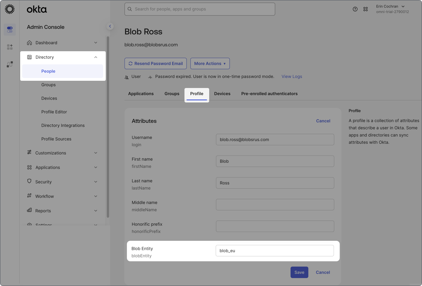 After you create the attribute, open the profile of each user assigned to the Omni application and define a value for the attribute. Refer to the Okta documentation if you need a refresher on how to do this.