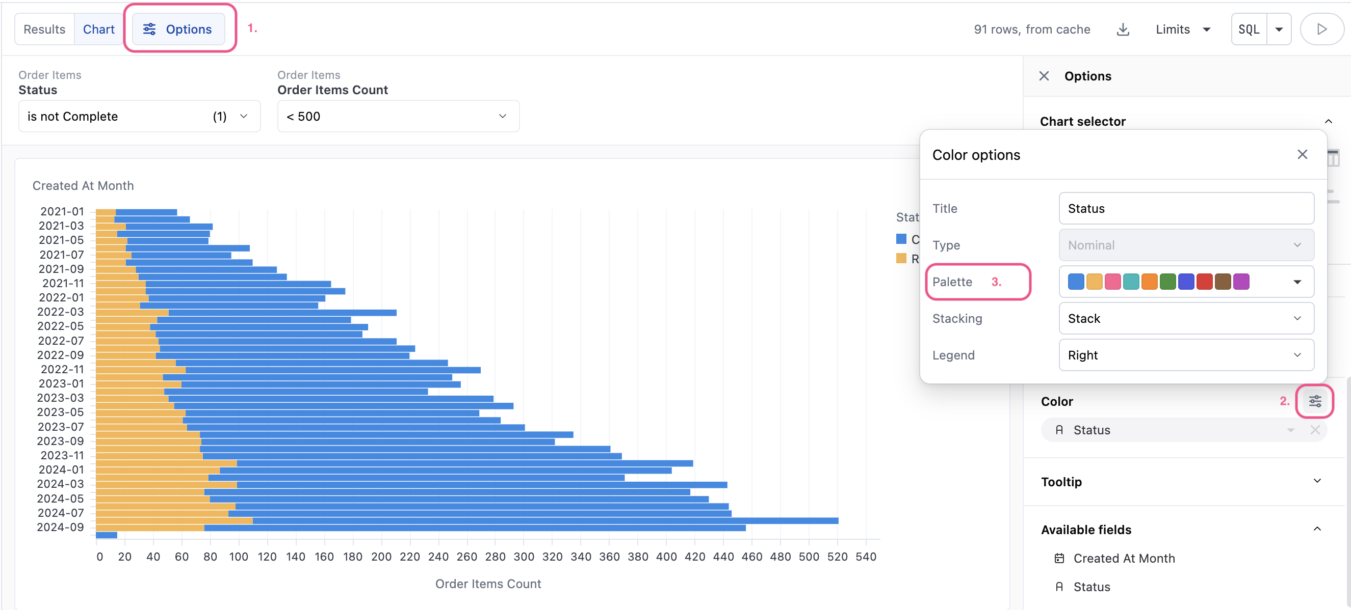 Chart palettes are currently only used for color faceting. You can access the chart palettes from the Options panel in the Color > Options popup. Any custom palettes created for the organization will appear in the list before the Omni-provided palettes. For more on using palettes in visualizations, see the Color by / Stacking documentation.