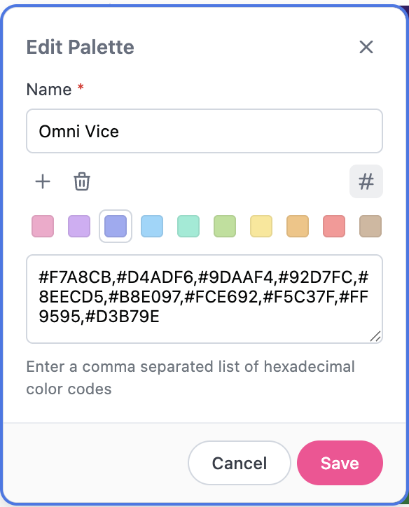 In Settings > Chart palettes, click the (three dots icon) next to a custom palette and select an option:- Edit - Make your changes and click Save when finished. Existing charts that use the palette will be updated with the changes.
