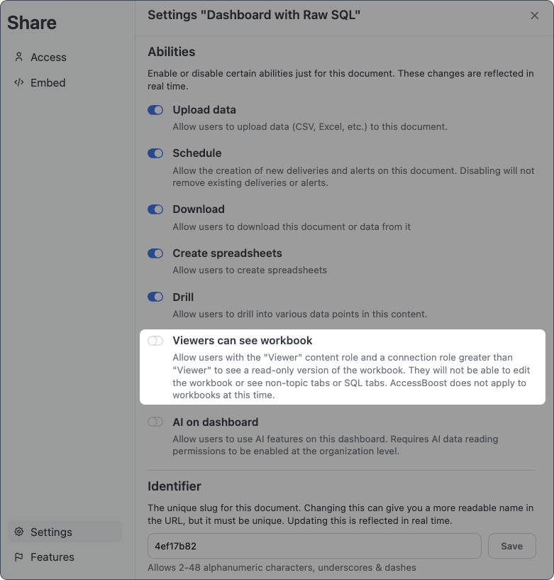 Workbook access for Viewers can also be enabled on indidvidual documents in Share > Settings and enabling Viewers can see workbook.Note: This requires the organization-level version of this setting to be enabled.