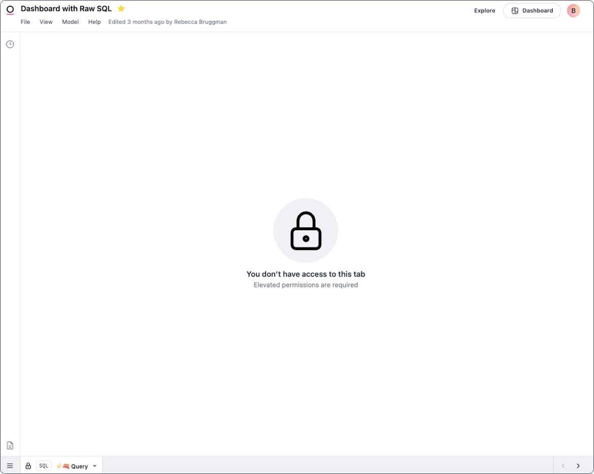 To resolve the error, the query associated with the tab must be rebuilt using a topic.Omni’s AccessBoost feature can be enabled, which would ignore data permissions usually enforced by connection roles, but this would only show the data on the dashboard not the query in the workbook.