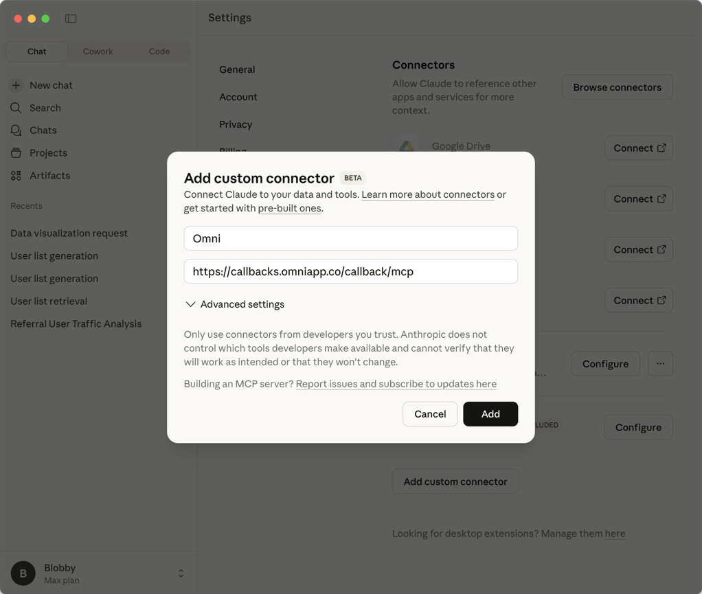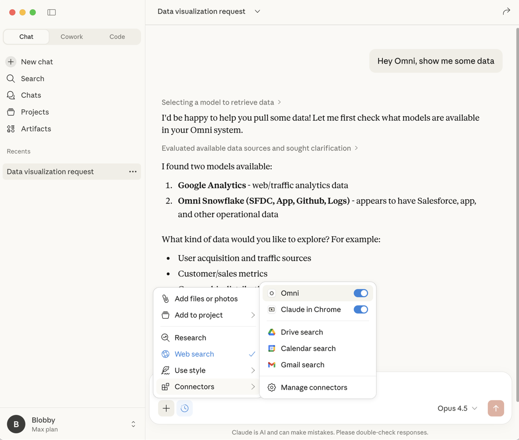 Once the MCP Server is connected, Claude Desktop automatically uses it when you ask questions about your data. You can prompt Claude to use Omni by referring to it by name or description.-