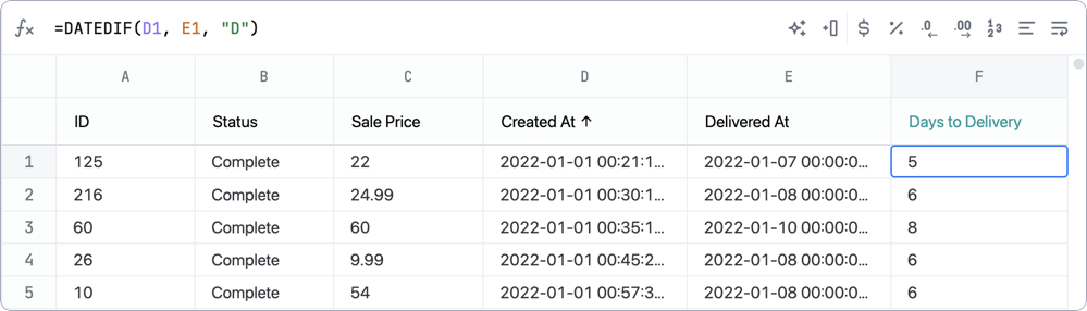 DATEDIFcalculation, which was used to calculate the number of days between theCreated AtandDelivered Atcolumns:
