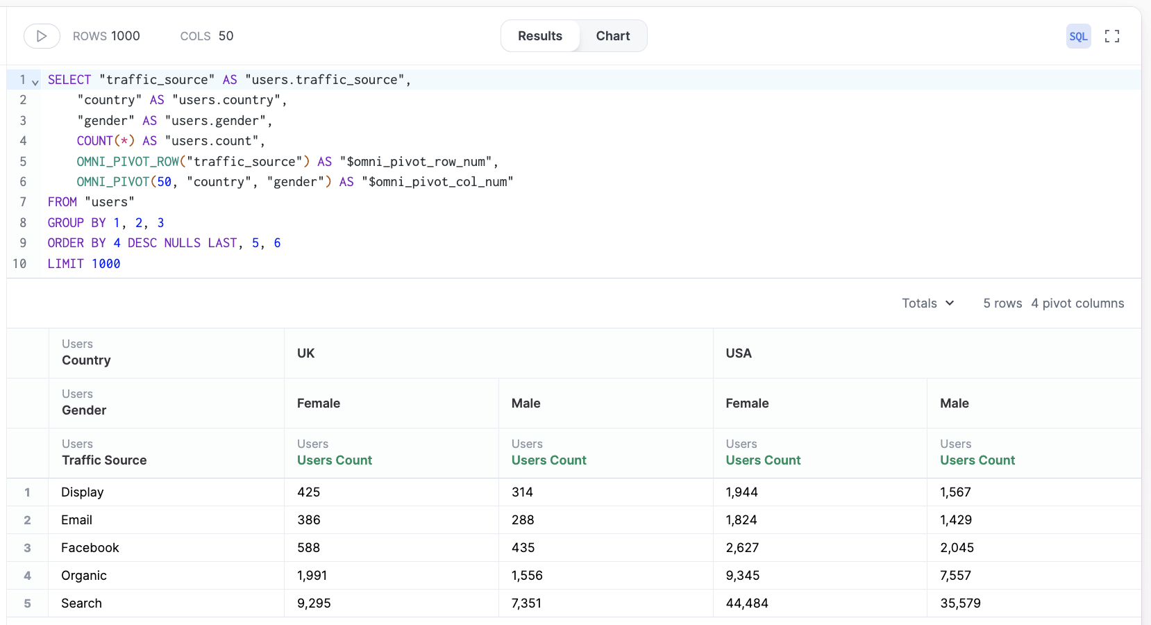 OMNI_PIVOT_ROW(dimensions) and OMNI_PIVOT(column_limit, pivots) structure the pivot table experience.OMNI_PIVOT_ROWsets the query columns outside the pivotOMNI_PIVOTsets the query columns to pivot, along with a limit on columns
