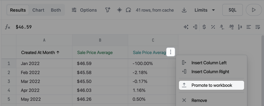 To reuse a calculation in a workbook, you can promote it to the workbook model. Click the ⠇ (three dots) in the calculation column’s header, then Promote to workbook: