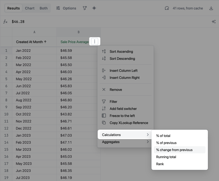 There are a few ways to create calculations in Omni:- Quick calculations, which allow you to create calculations like a running total or % of previous with just a few clicks