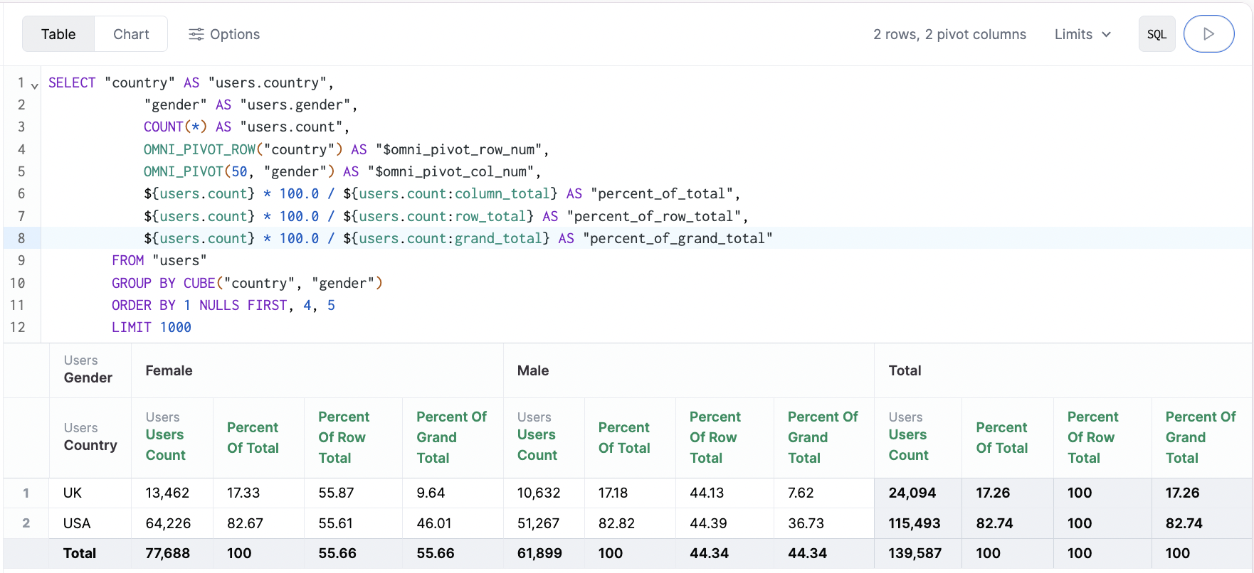 ${users.count:row_total} - Grand total (columns and rows, lower right) -