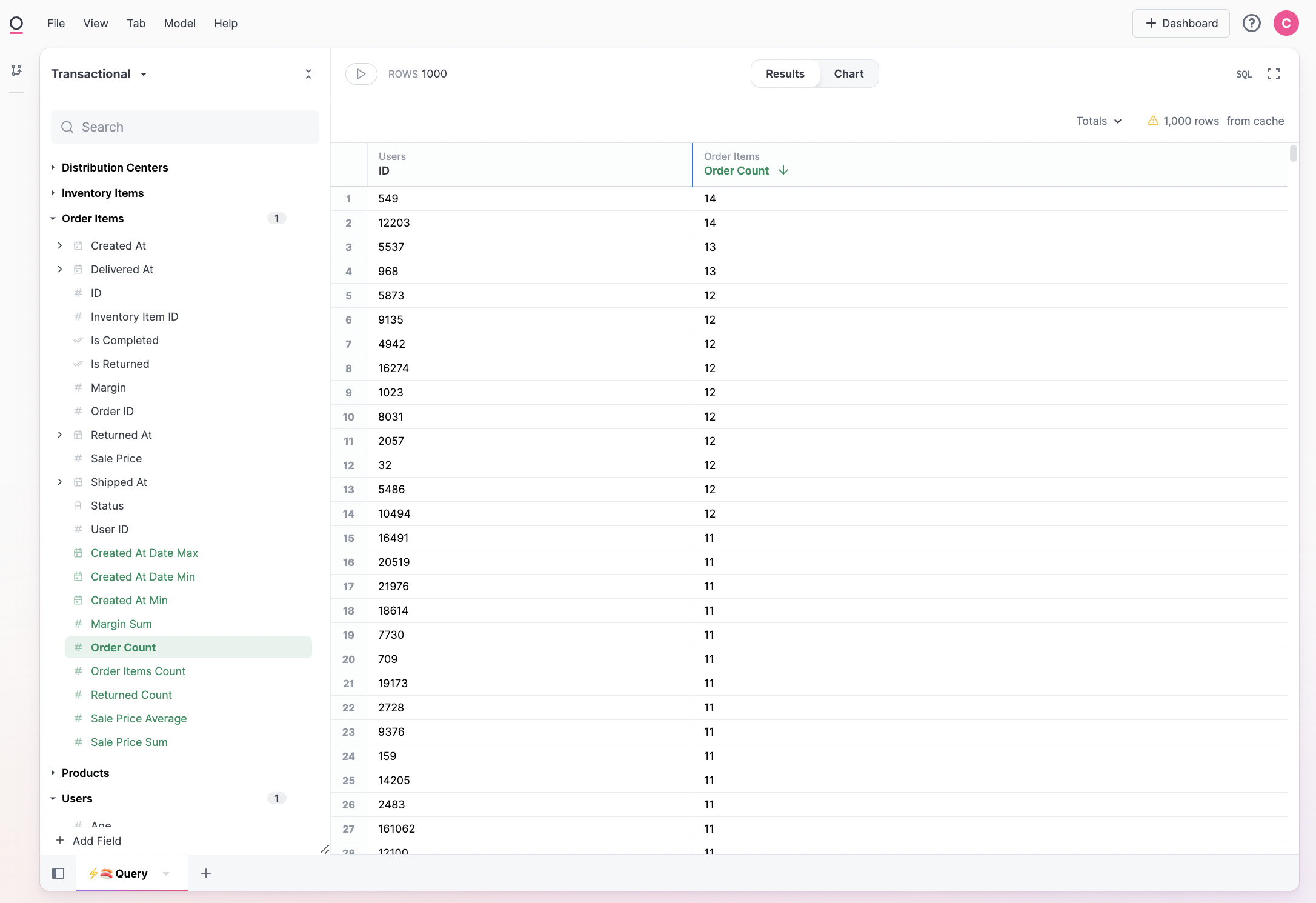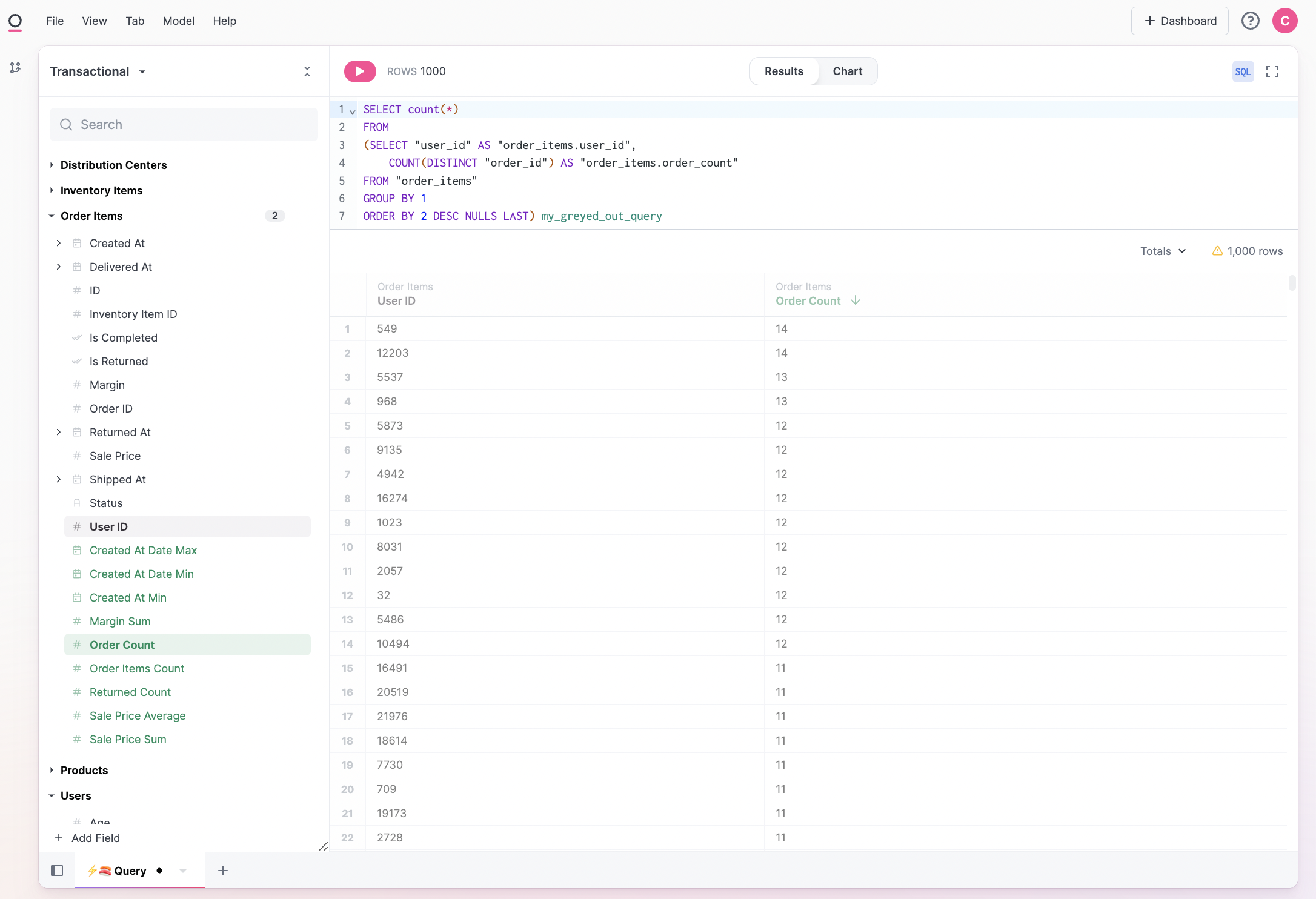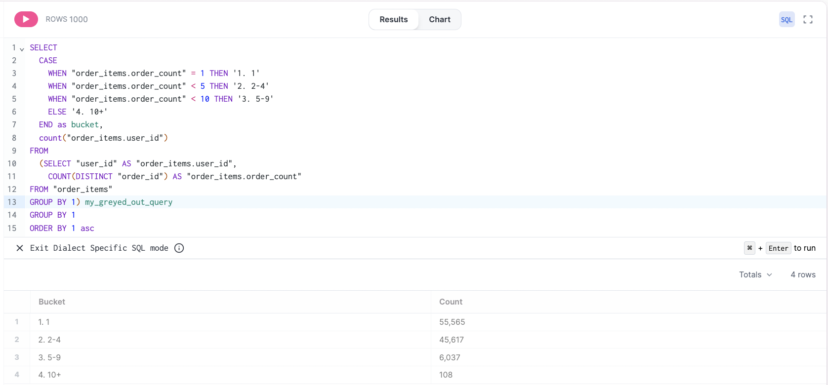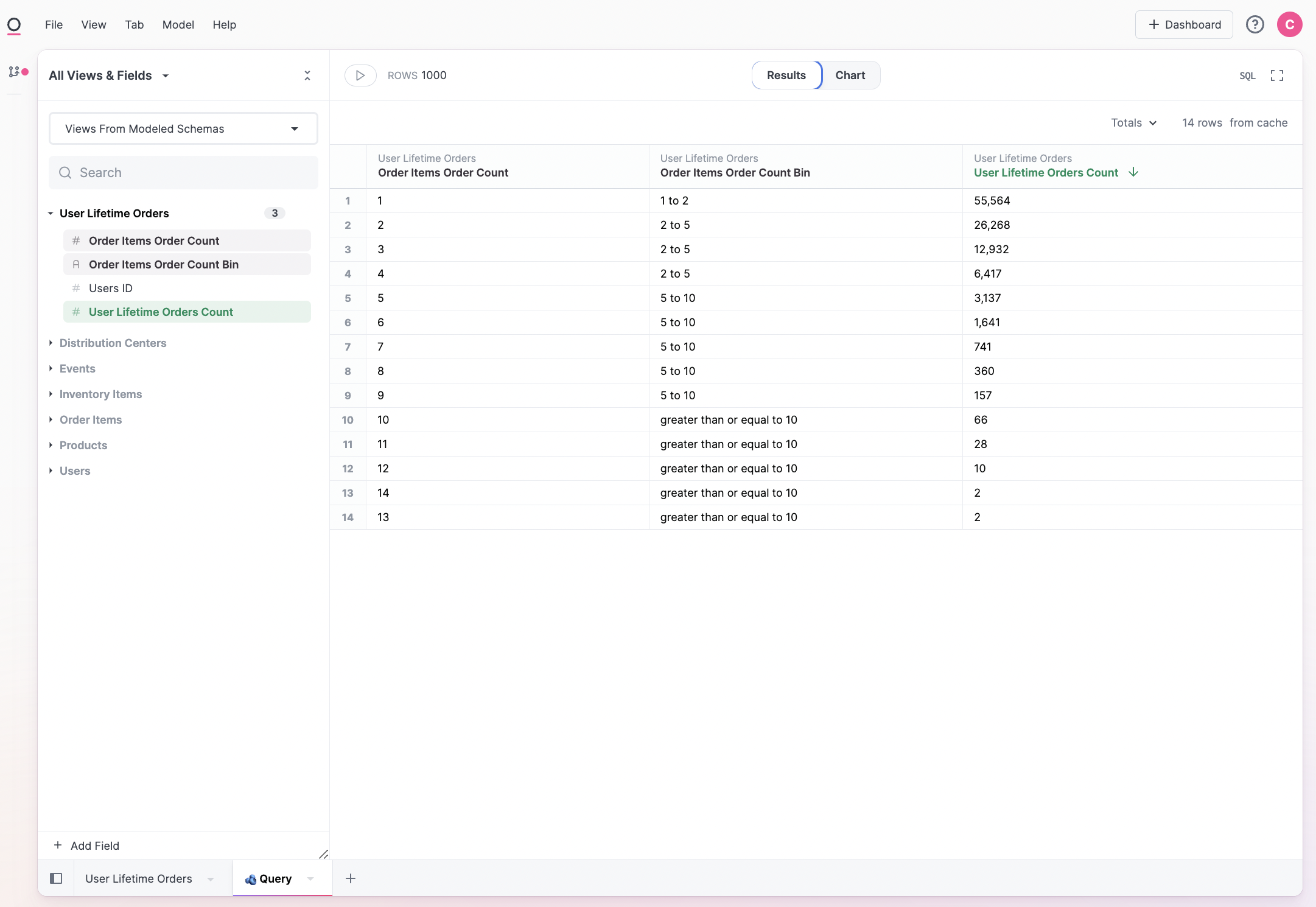 - Build baseline query where we want to analyze distribution. Here we’ll look at lifetime orders per user: