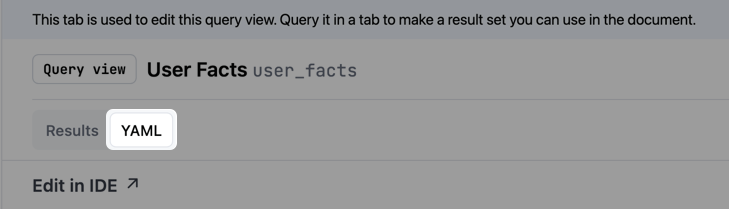 In the Files panel of the modeling IDE, locate the view in the Schemas section. Click the view to open it in the editor.You can also view a read-only version of the query view’s YAML configuration right in the workbook. Open the query view like you’re going to edit it, then click the YAML toggle near the top left corner of the page: