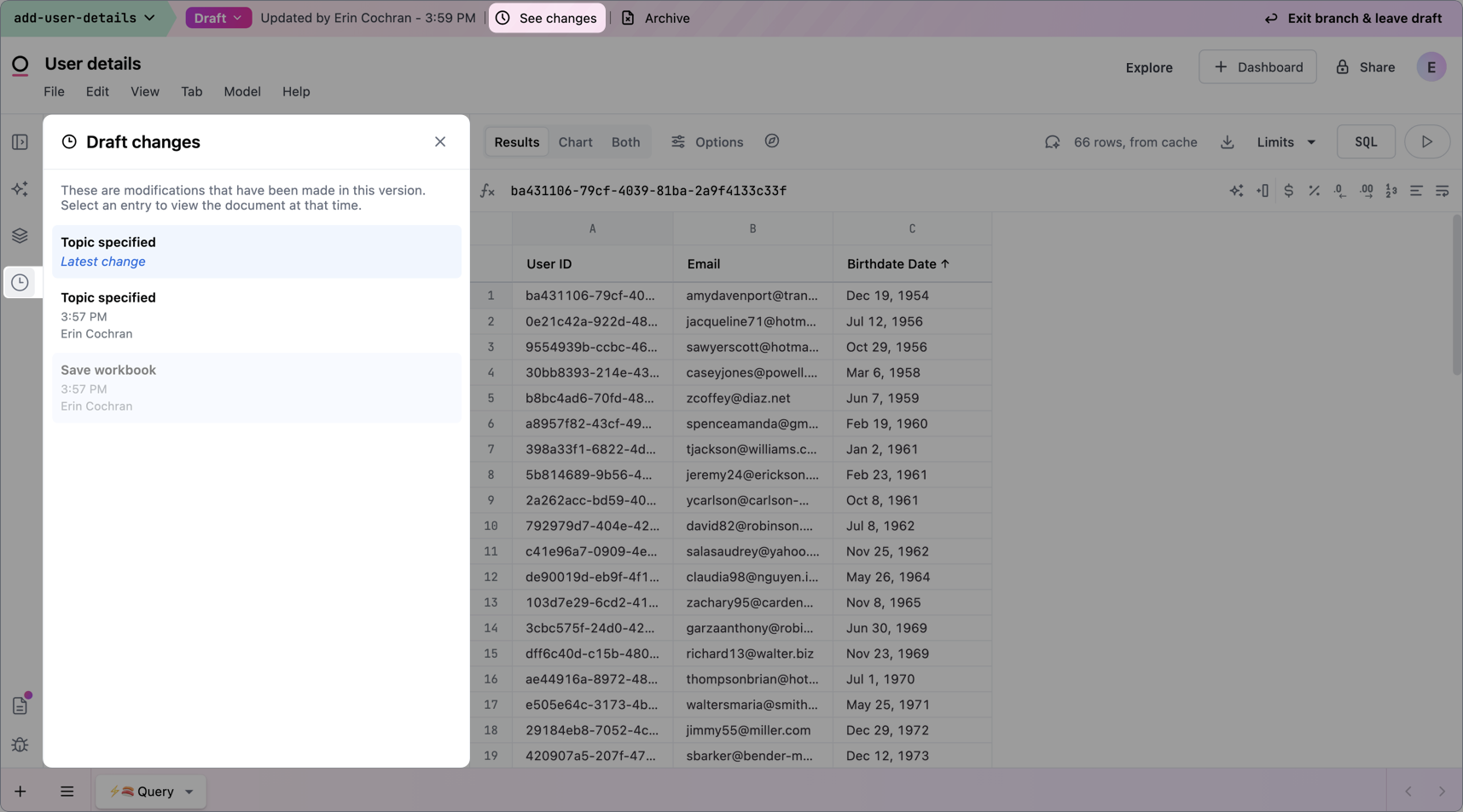 To demonstrate why branches are useful, let’s look at an example that starts with a change to a shared model.When changes are made directly to a shared model, the model’s history might look like this:The changes in this example were immediately applied to the model. If a query had been using the modified field, its logic and results could have changed unexpectedly. These differences might not be noticed right away, potentially leading to incorrect conclusions or broken content.Now consider this example, where changes to the model and impacted documents were made together in a branch:In this example, the branch contained updates to the field logic and impacted documents. You could navigate to documents that use the field, open the branch, and make the changes required to ensure the updated data was correct.When everything worked as expected, you would then merge the branch, applying the changes to the live version of the model and publishing new versions of the documents at the same time.Want to learn more?Check out this blog post to learn more about why traditional development practices - like branches - are useful for modern data teams.