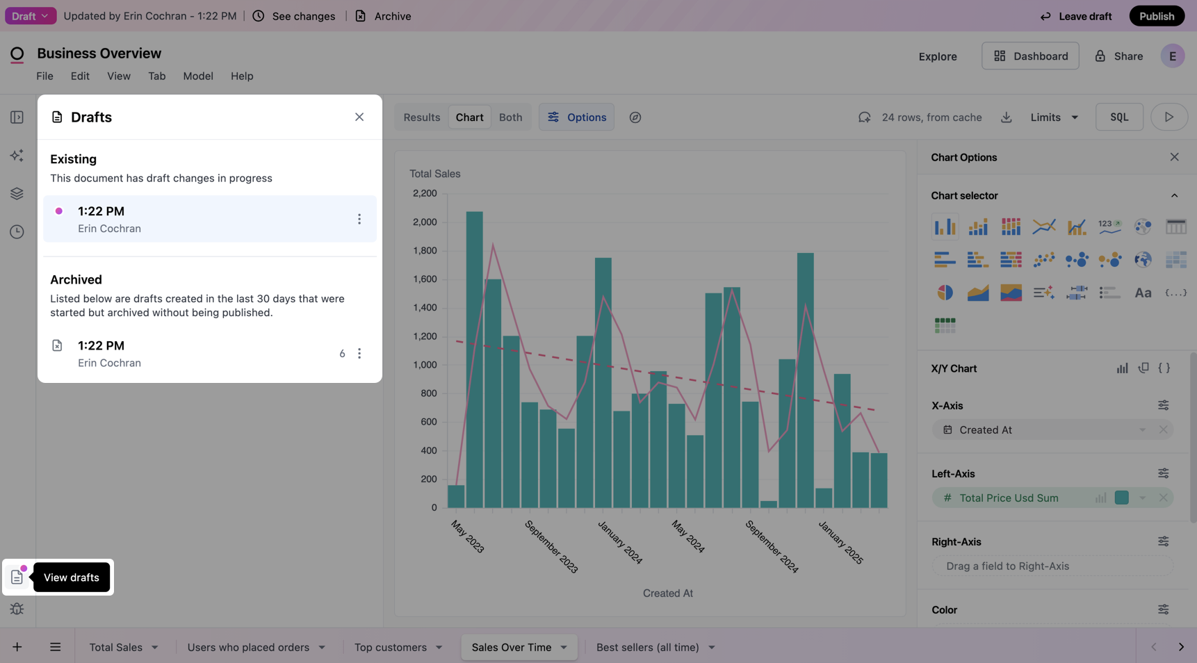 A draft is an isolated copy of a document, including its workbook and dashboard. In a draft, you can make changes to the queries in the document, add visualizations, modify the dashboard, and so on without impacting the live - or published - version of the document.
