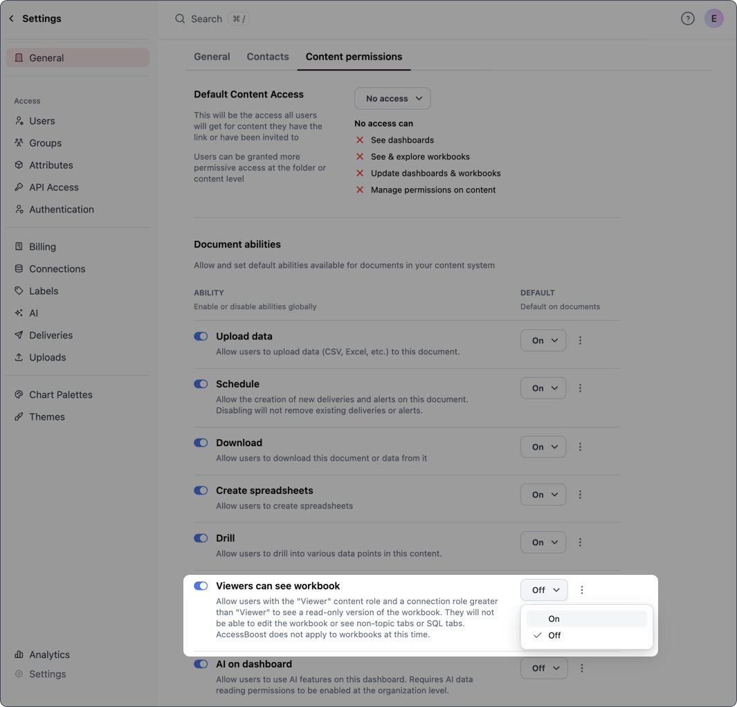 How to fix it | Enable document ability (organization-level)Organization Admins can change this default behavior in Settings > General > Content permissions with the Viewers can see workbook setting. Click the toggle in the Ability column