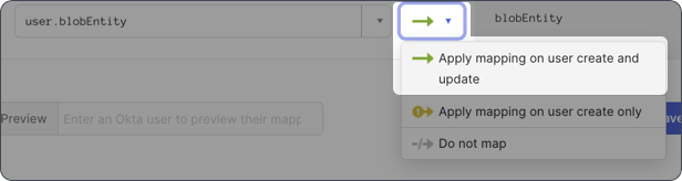Use the arrows in the middle of the dialog to set the attribute to Apply mapping on user create and update: