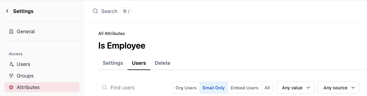 - Click Settings > Users > Attributes tab