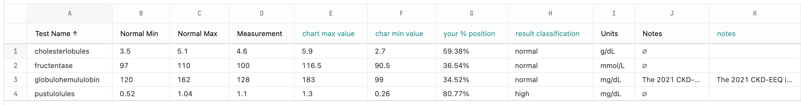 The code for these examples can be used in the Markdown visualization to create a series of cards that show a consistently sized chart across "tests" that can have a variety of ranges. Inspiration for these charts were taken from blood test results where measurements for a "normal" range vary in units, min and max values.