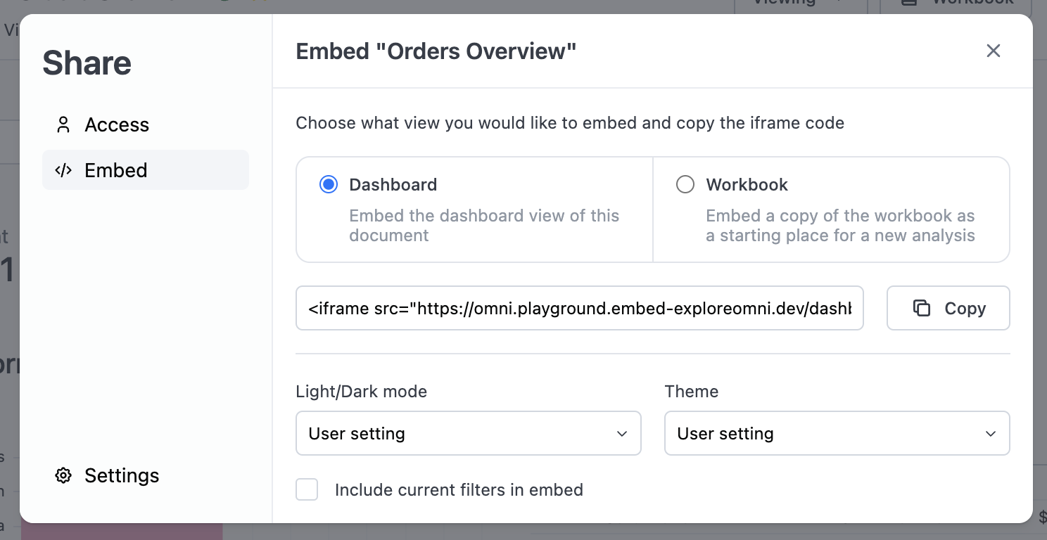 To follow this guide, you’ll need:- Permissions in Omni that allow you to access the dashboard you want to embed