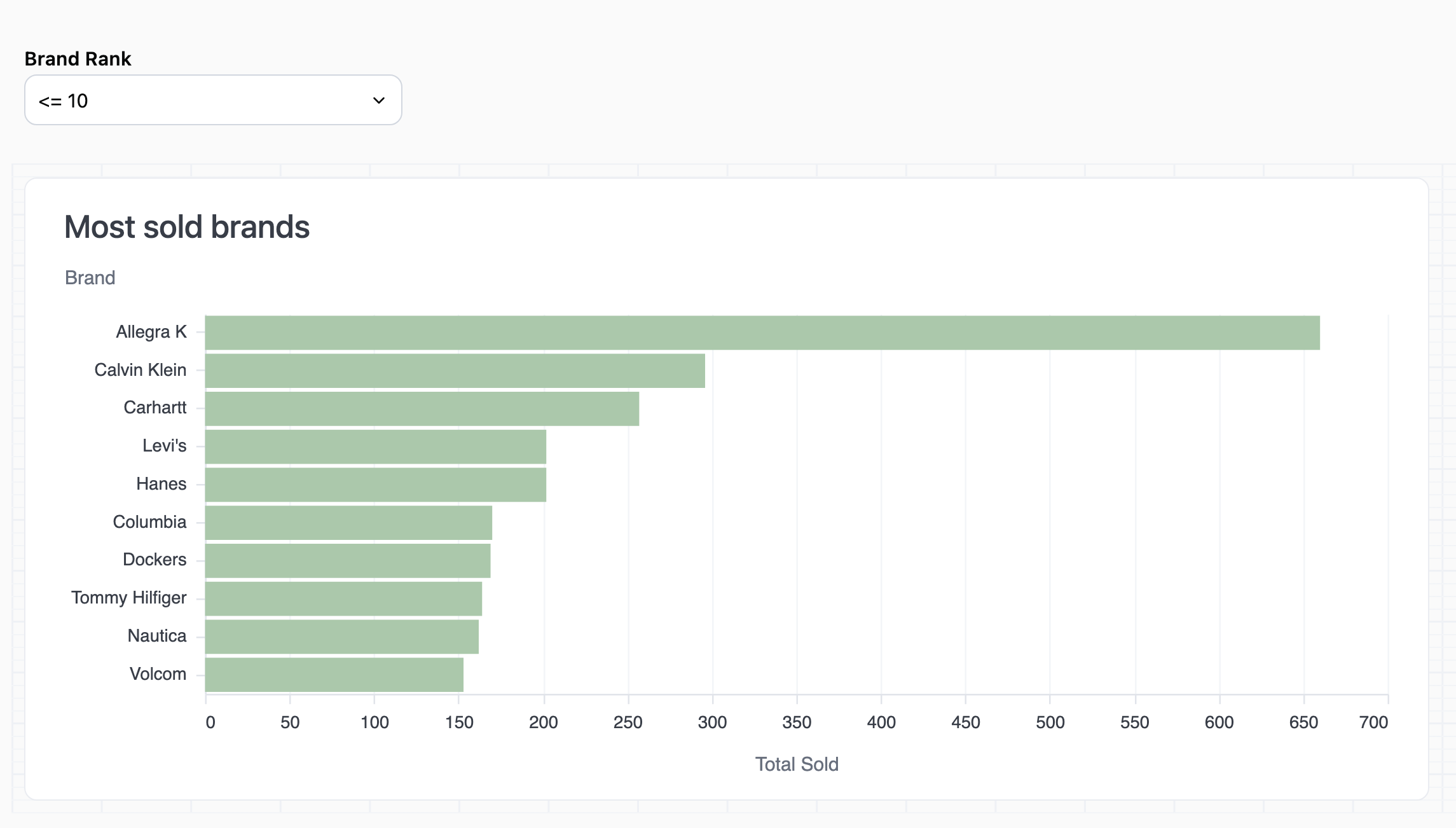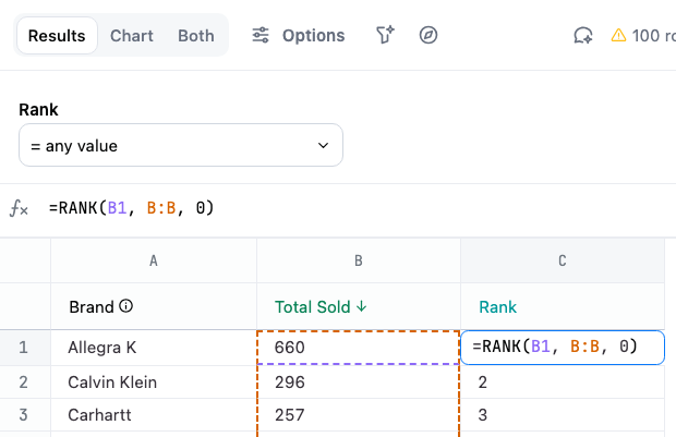 RANK calculation that uses the value of the Total Sold column to rank results: