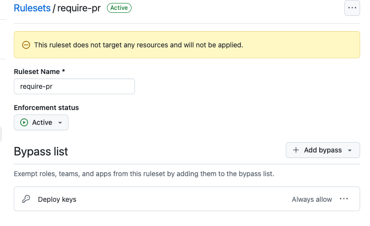 Require pull request before merging,Block force pushesandRestrict Deletions. - On the same ruleset’s settings, add a bypass to the bypass list.