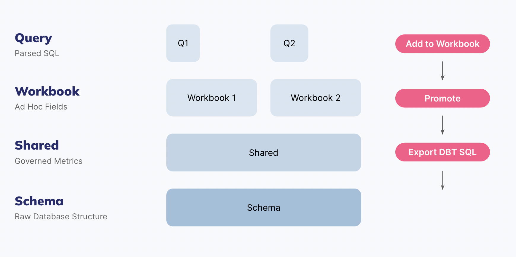 The Omni data model is composed of layers. The schema model reflects the raw database, with subsequent layers above. The shared model represents the universal, governed data model that each new workbook is based on. Finally the workbook model extends the schema model and shared model. This is a simple way to think about modeling in Omni: