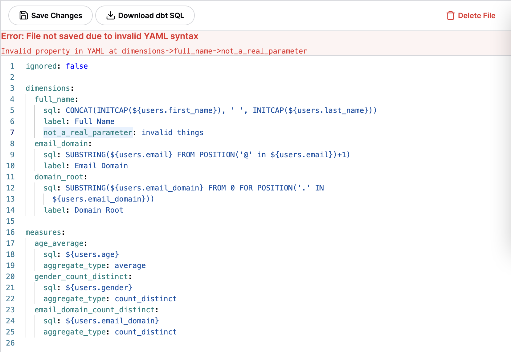 Omni models have strong validation. Errors in YAML syntax or property names are rejected without being saved. This will be softened over time and the UX will be improved, but be aware that invalid code may be rejected on save in the data model. Field typing is implicit in Omni based upon the dialect and functions applied. To change types, simply cast fields in SQL. When the schema model is updated, breakage can occur in layers above. The model IDE will provide pointers to broken field references to resolve any issues, for example when columns are deleted beneath Omni.