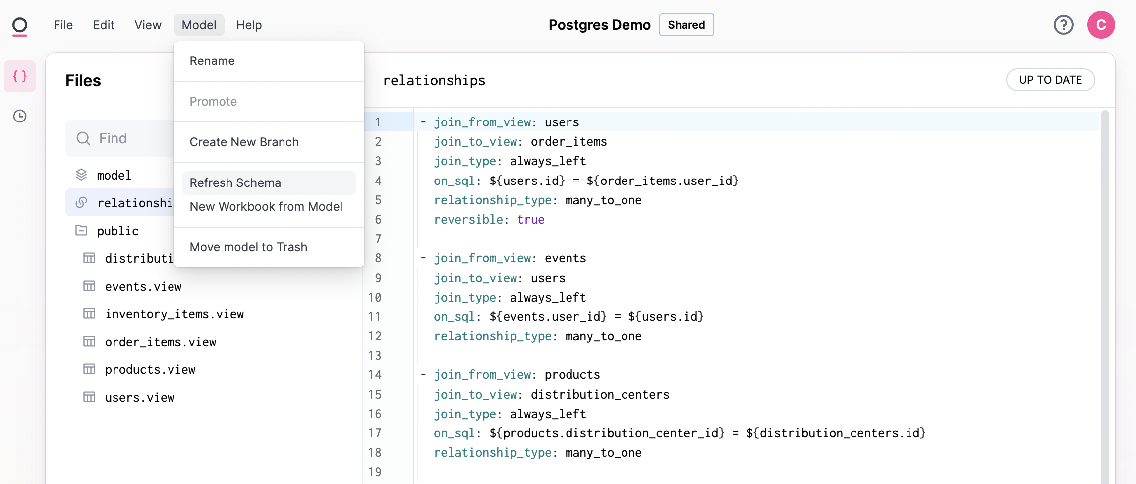The schema model is intended to serve as a baseline version of the database schema, for simple point and click query, and some inferred key relationships. The schema model is not viewable or editable for users. To refresh the schema, click Model > Refresh schema inside the given schema model: