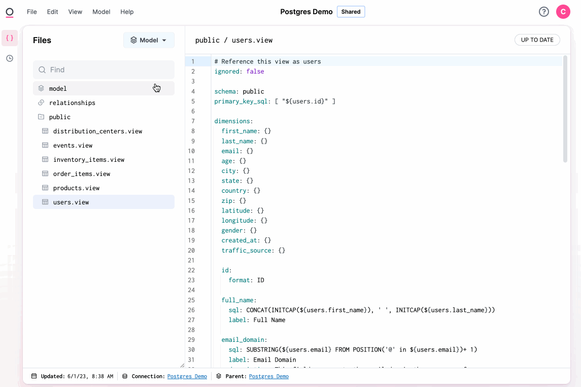 - The model extension, where user-defined, virtualized data models live in Omni. Think fields, joins, and additional metadata such as formats, descriptions, and so on.