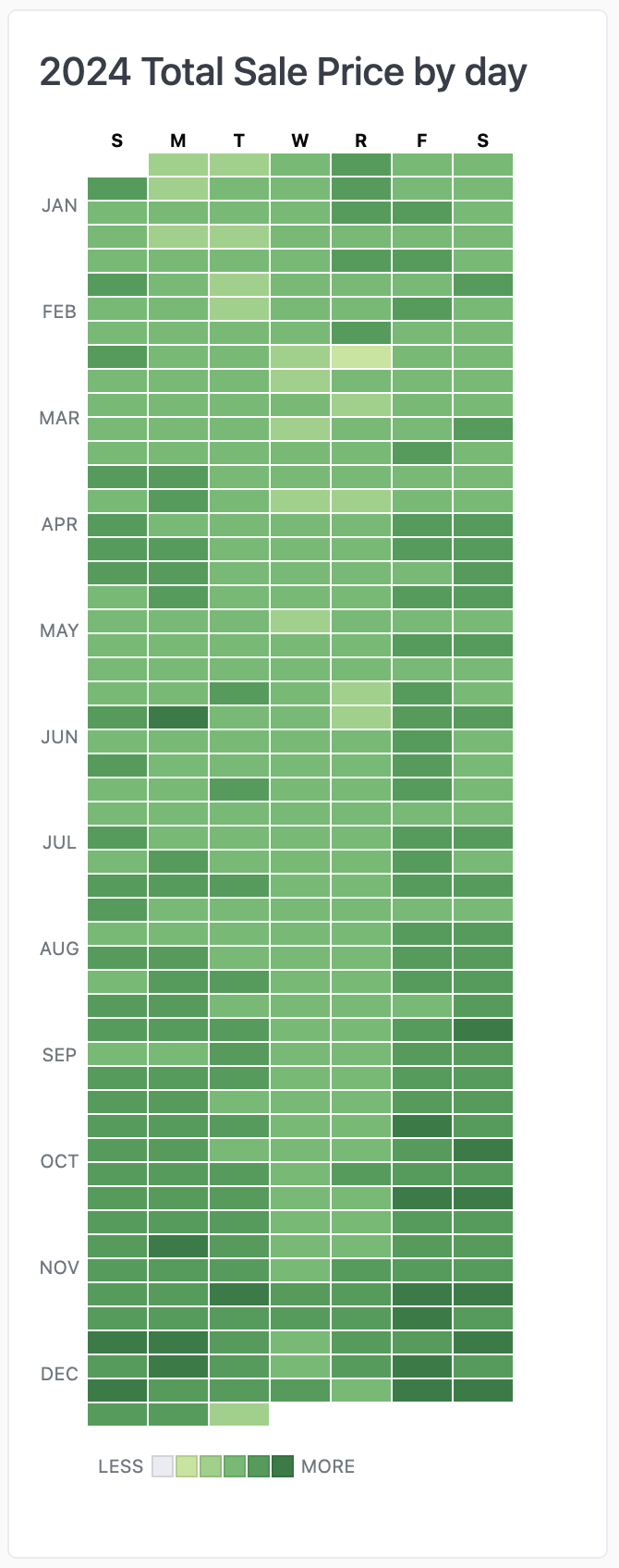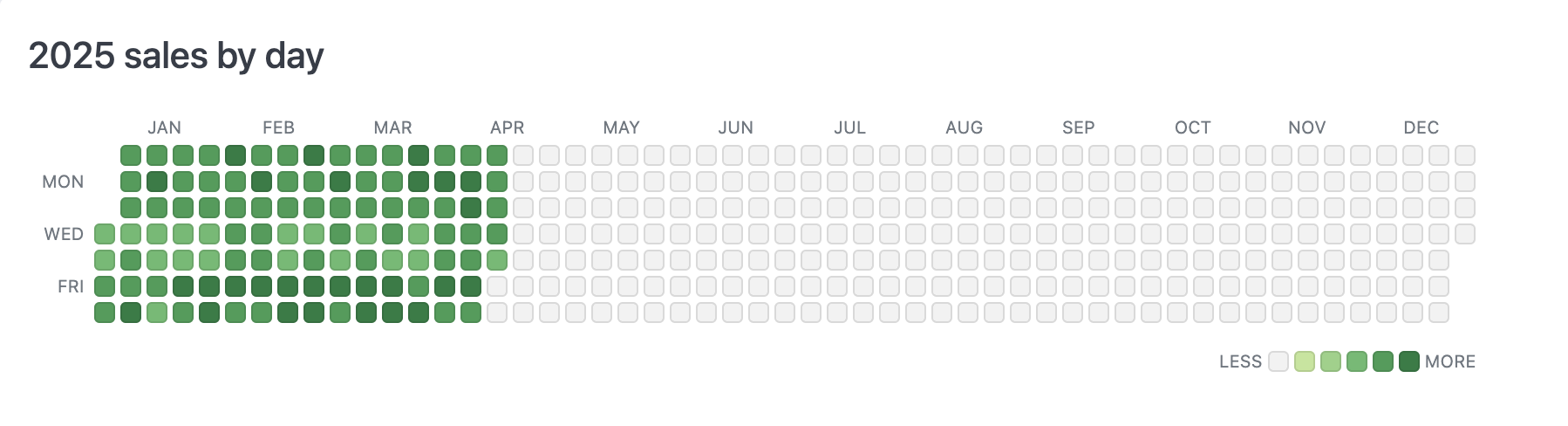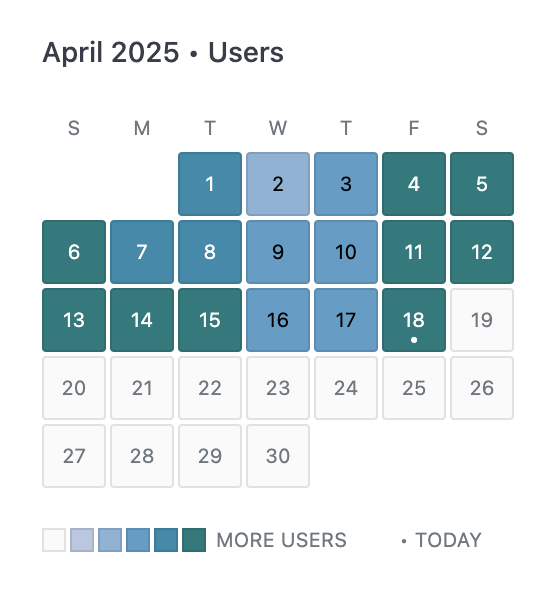 The example below is customized to work for 2025. For different years, youโll need to adjust the number of empty<li> tags to get the data starting on the right day of the week.