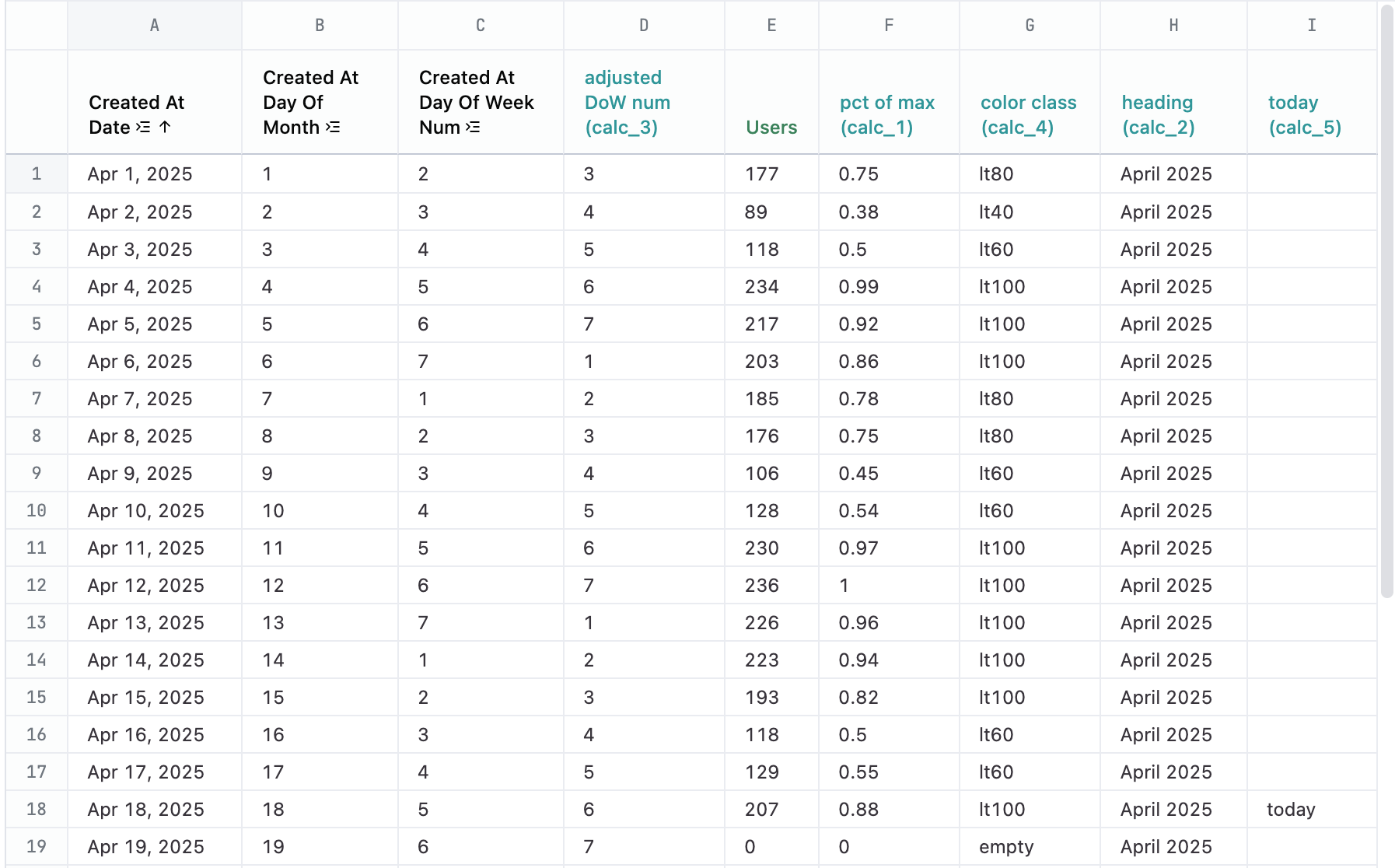 | D | adjusted DoW num (calc_3) | =MOD(C1, 7) + 1 | Our data starts counting week on Mondays. This adjusts the start day of the week to Sunday. |