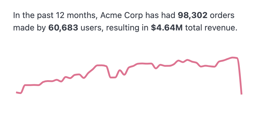 In the past 12 months, Acme Corp has had **{{result._totals._first.order_items.order_count.value}}** orders made by **{{result._totals._first.users.count.value}}** users, resulting in **{{result._totals._first.order_items.sale_price_sum.value}}** total revenue.<br><br><Sparkline field="order_items.order_count" color="#ED6C91" height=70% width=100% reverse=true></Sparkline>