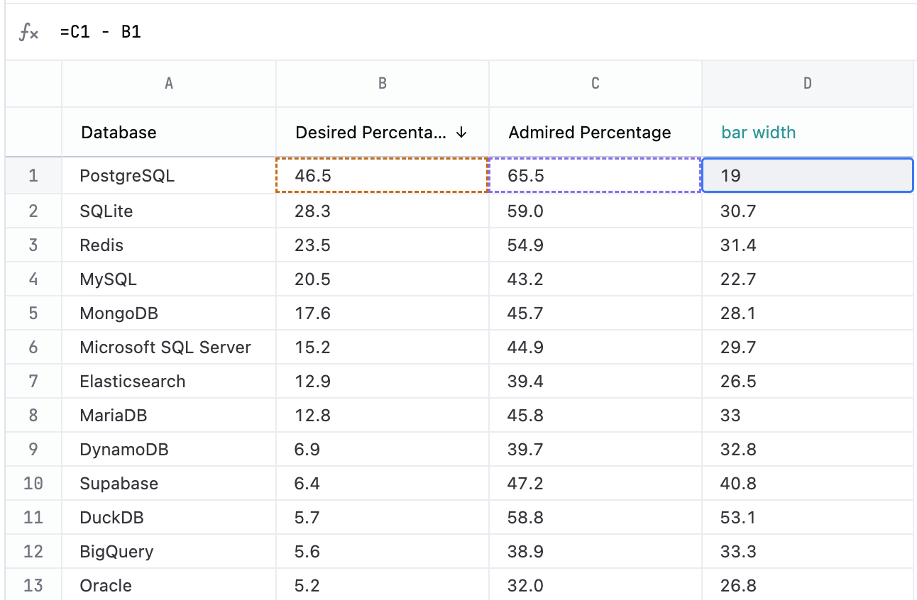 These charts use the Mustache iterator syntax to draw a chart for each row in the results. Your query should have a column with the category label for each dumbbell that you want to display along with the start and end values for each category. Additionally, you’ll need a calculation to get the length of the bar. Note: This example only covers a positive change between start and end values. You’ll need to make some adjustments if the change you are measuring can also be negative. The following table explains each field used in the example, including the calculation formulas.