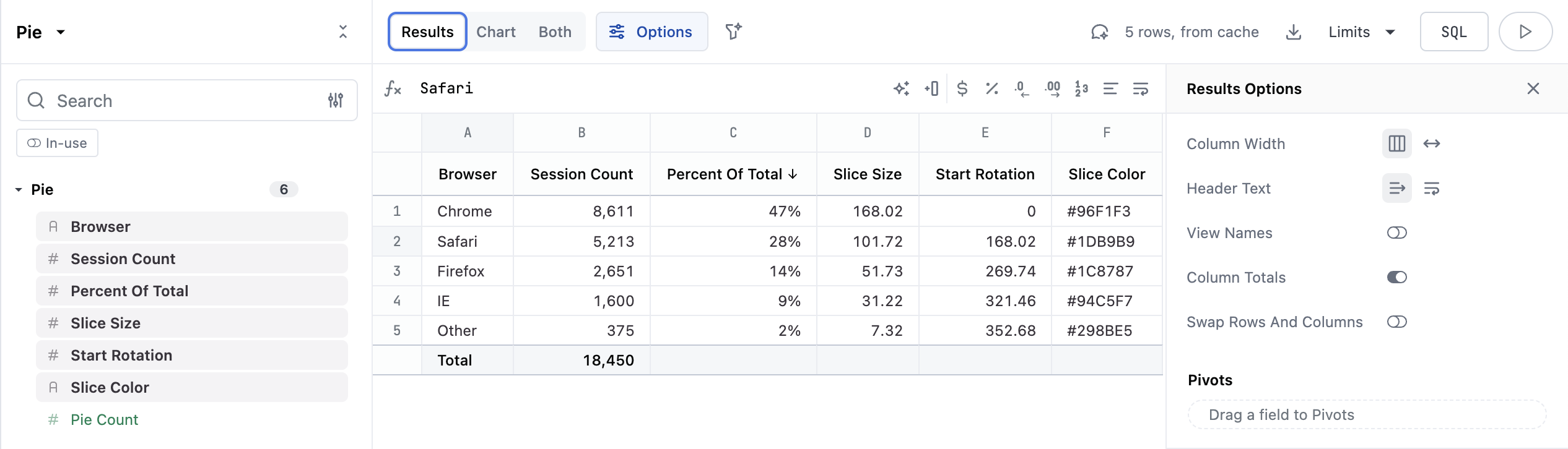 Pie Countshould be selected when youβre finished. - On the Results tab, open the Options panel and enable column totals.