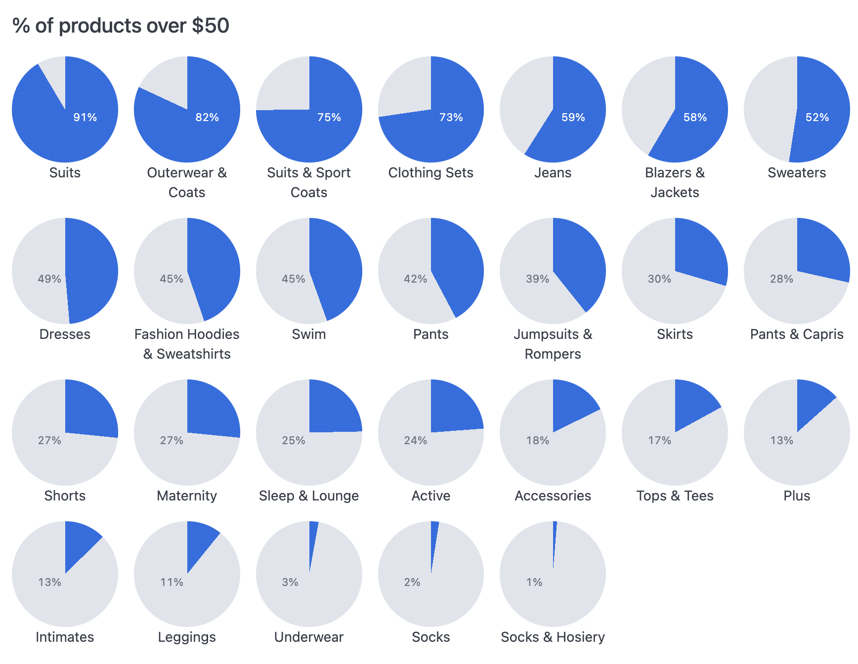 | D | % over $50 (calc_1) | =C1 / B1 | calculation for filling pie, label |
