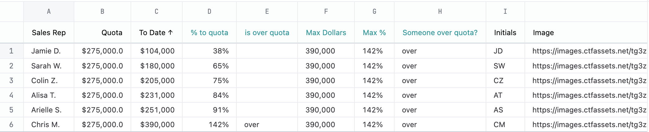 | F | Max dollars | =MAX(MAX(C:C), B1) | needed for calculating positions if anybody is over quota |