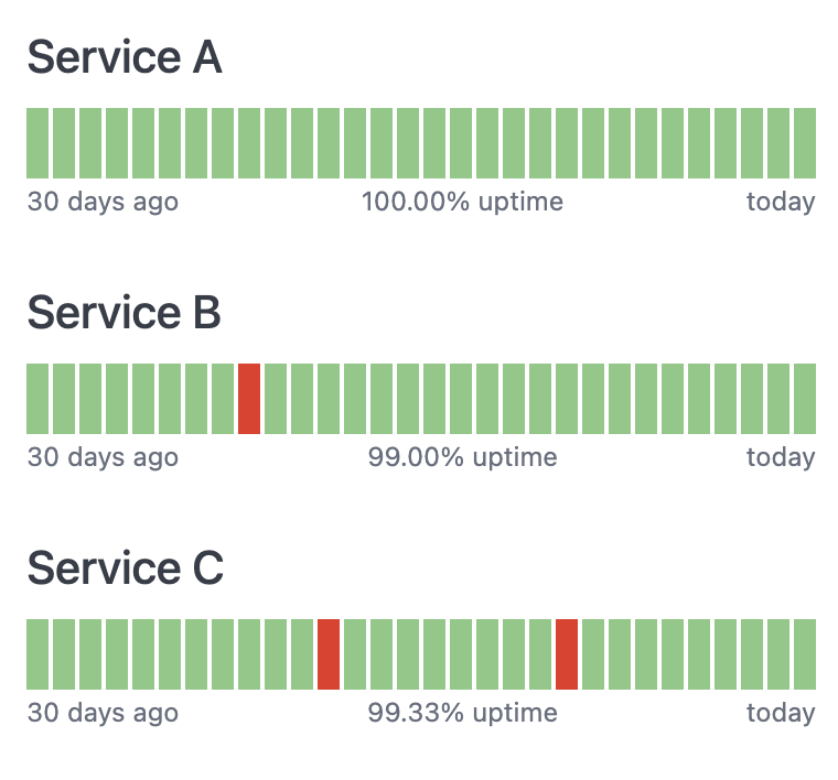 This example shows the last 30 days of data, coloring any day red if the service level percentage is anything but 100%.
