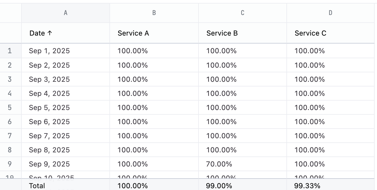 This chart has a simple structure - the time slot and a % value for each chart you want to make. Add column totals to the query and change the total calculation toaverage to add the average uptime below each chart.