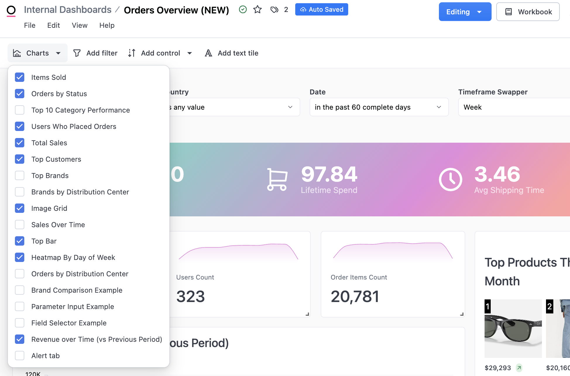 To view the options for editing a tile’s content or appearance, hover over a tile and click the (three dots icon) in the top right corner. If you have dashboard filters, keep in mind that when you are viewing a specific workbook tab in edit mode the dashboard filters aren’t applied so the results may look different.Hiding charts