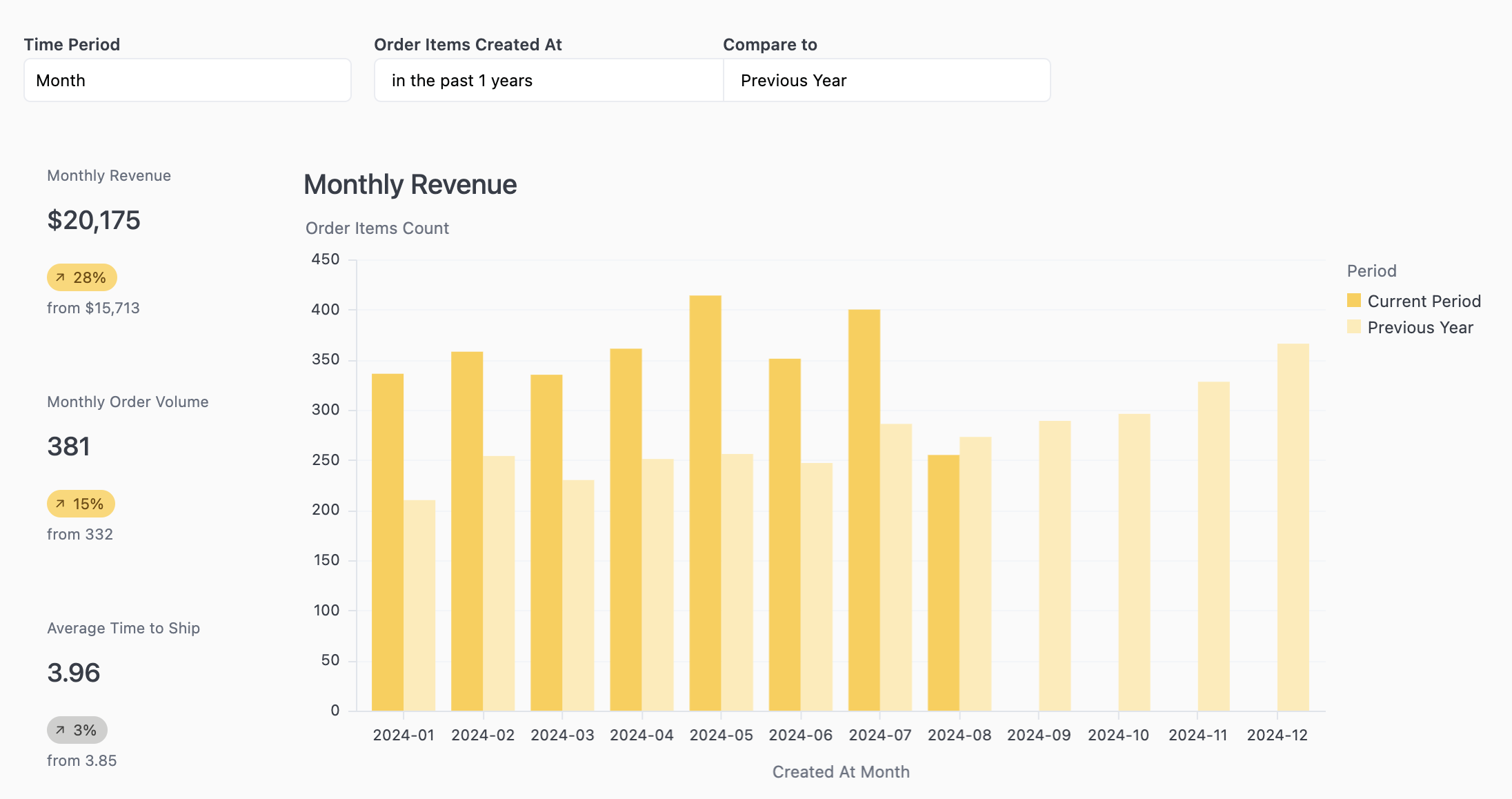 To compare a metric between time periods, use a period over period control. When configuring, select the underlying date field that controls the time periods you want to compare. Choose the current period and one or more comparison periods. Any attached charts will break down the metric between the current and previous time period(s).