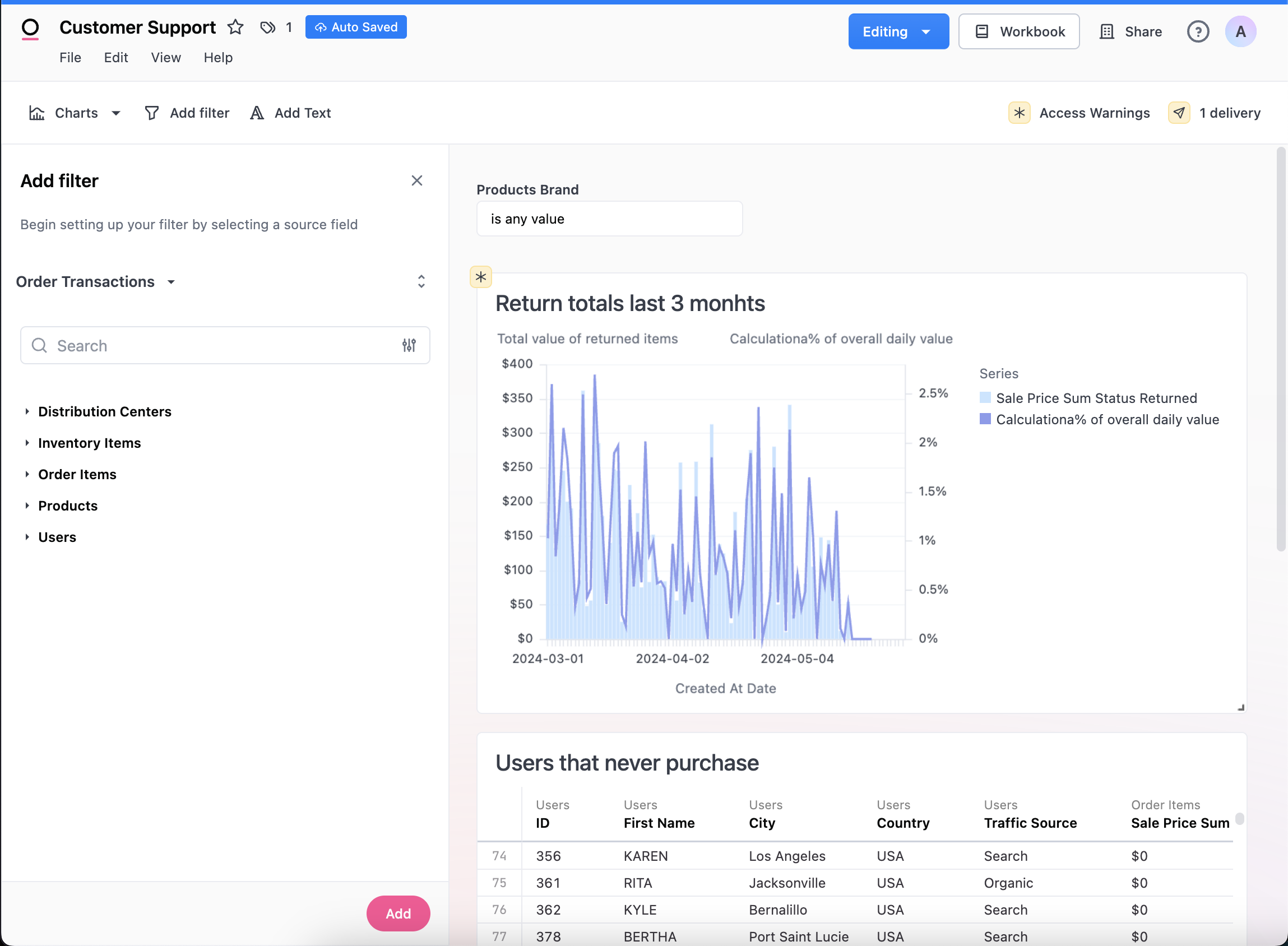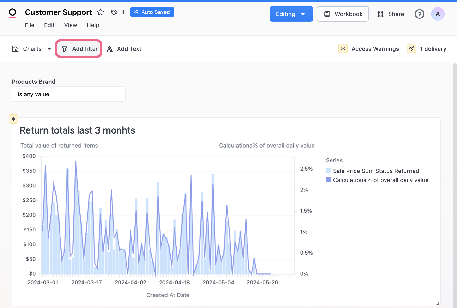 To add a filter to the dashboard, enter edit mode and click Add Filter. Choose the field you want to base your filter on. The field you choose as your filter base will determine:- where suggested filter values come from