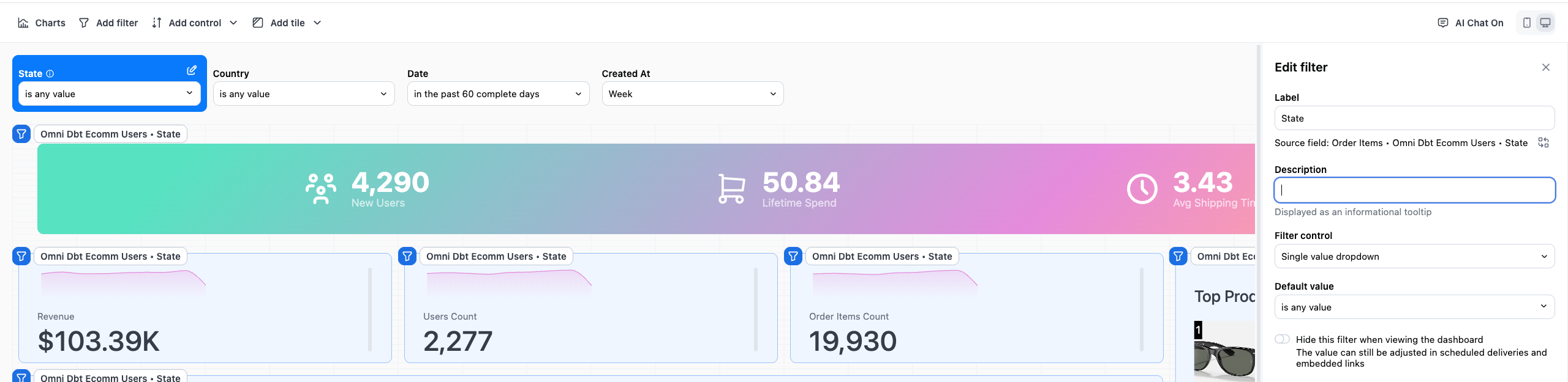Filters can optionally be mapped to different fields on each tile. A common example is when you have a dashboard date filter, but want it to update a different date field on each tile (e.g. the users tile uses user_created_at and the orders tile uses orders_created_at). To configure, edit the filter then on the top right of each tile, select the field you want to map the filter to.