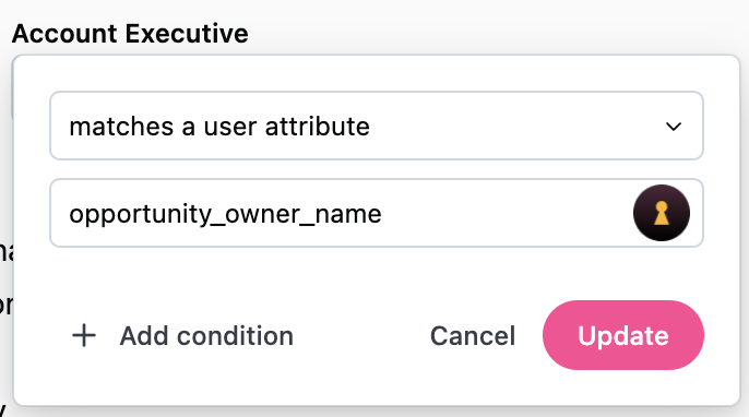 Filter values can be set to a user attribute so that the default filter value changes based on the user accessing the content. This is useful for when you want to create a single dashboard and have it dynamically filter the information to the end user. One example is a sales dashboard with a filter set to an attribute on Account Executives name, so when that user views the dashboard it is automatically narrowed to their own deals.