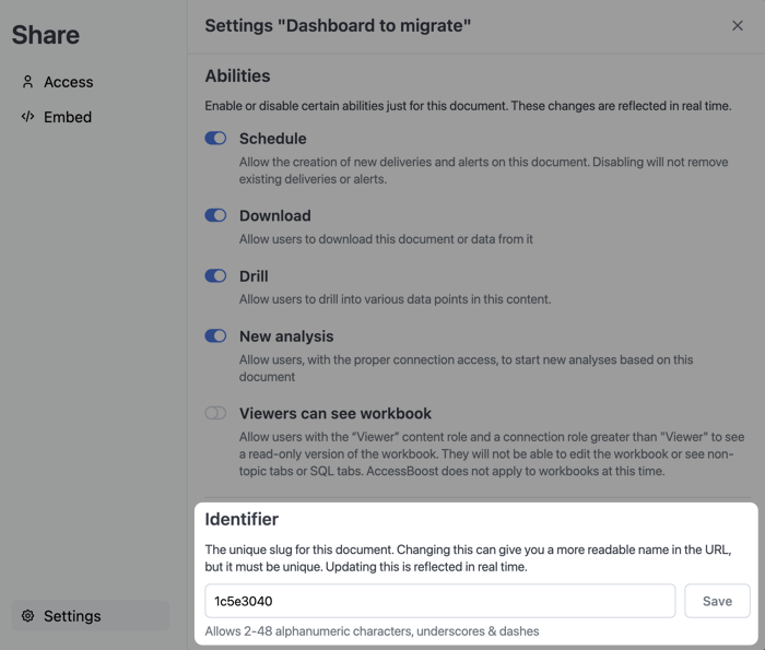 Opening the dashboard settings. Navigate to File > Document settings. The Identifier field contains the dashboard ID: