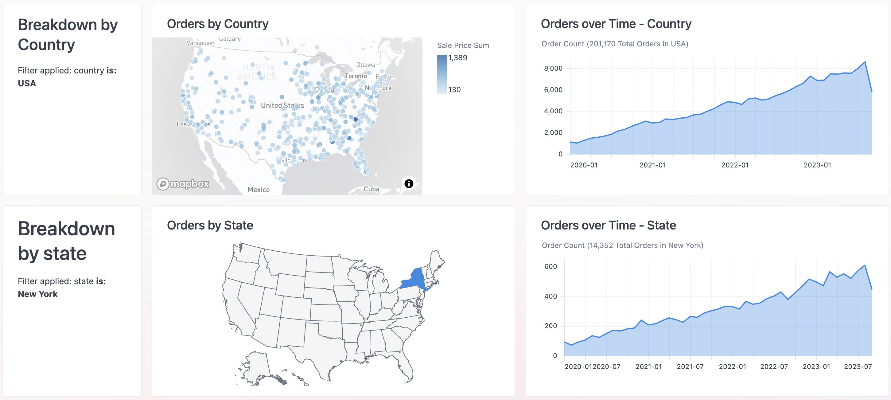 Omni supports Mustache syntax in Markdown visualizations and dashboard Markdown tiles, making it easy to add dynamic content to your dashboards. For example, the Breakdown tiles on the left side of the following image use Mustache to dynamically insert the current value of a filter: