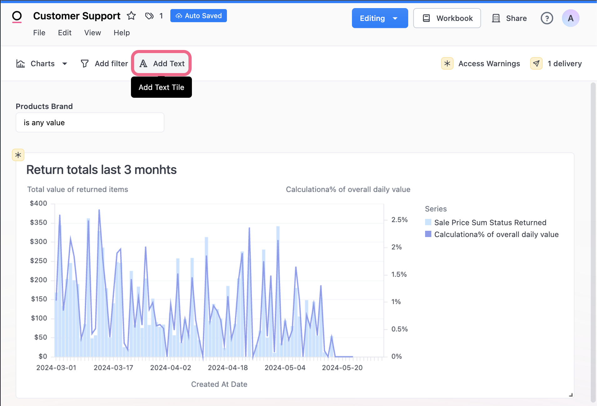 To add text to the dashboard, go into edit mode and select Add Text. Text tiles support markdown so you can add styling, images, links, and more. See a markdown syntax reference here.