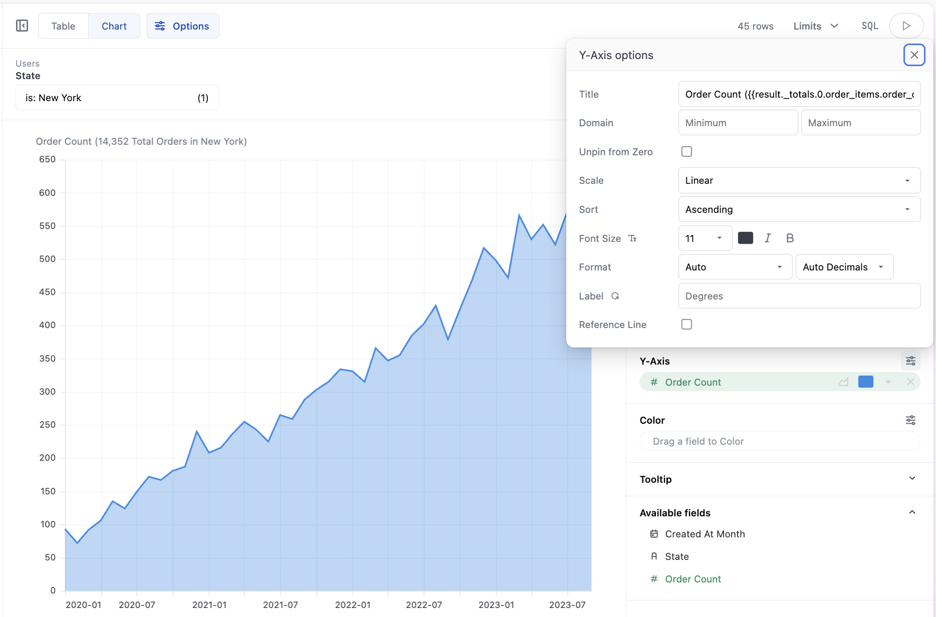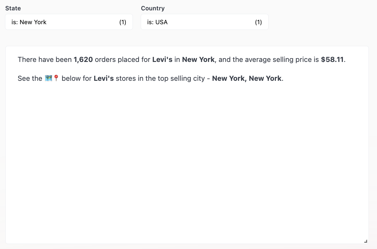 In this example, Mustache tags create a dynamic y-axis label that displays summary values and filter details.Note: Line breaks have been added for readability: