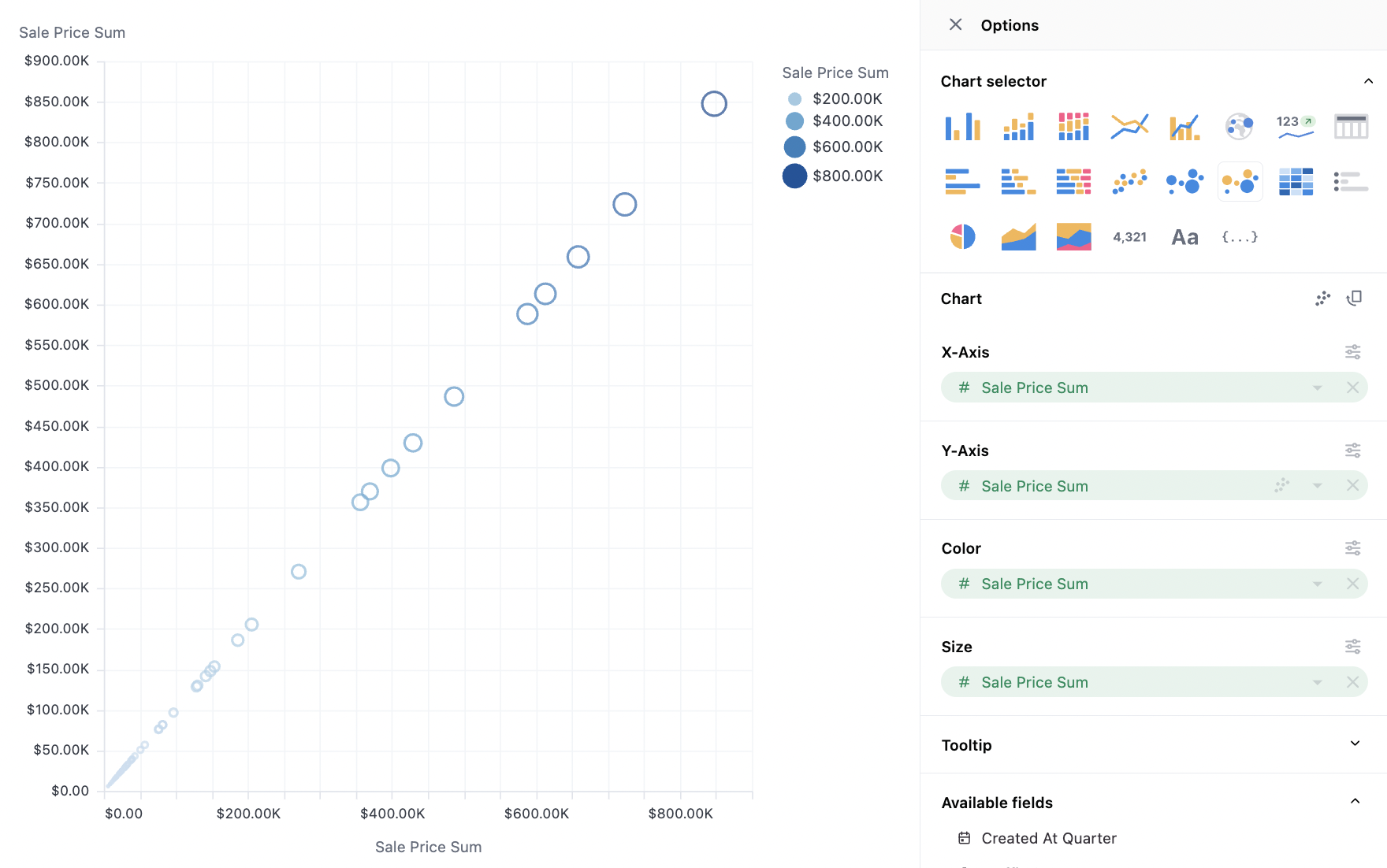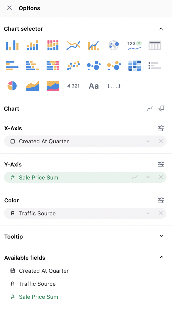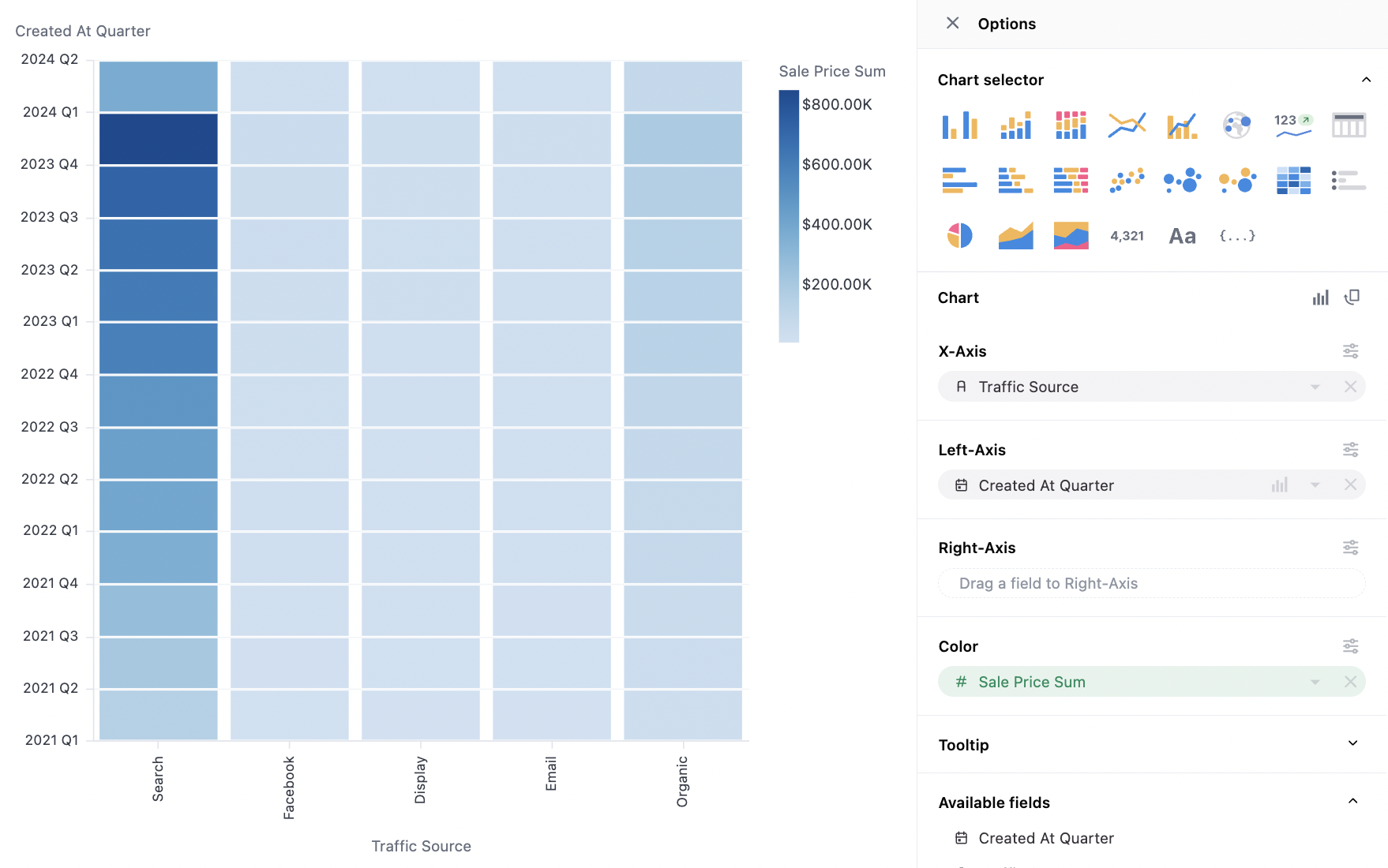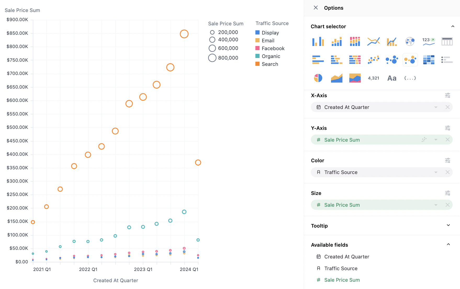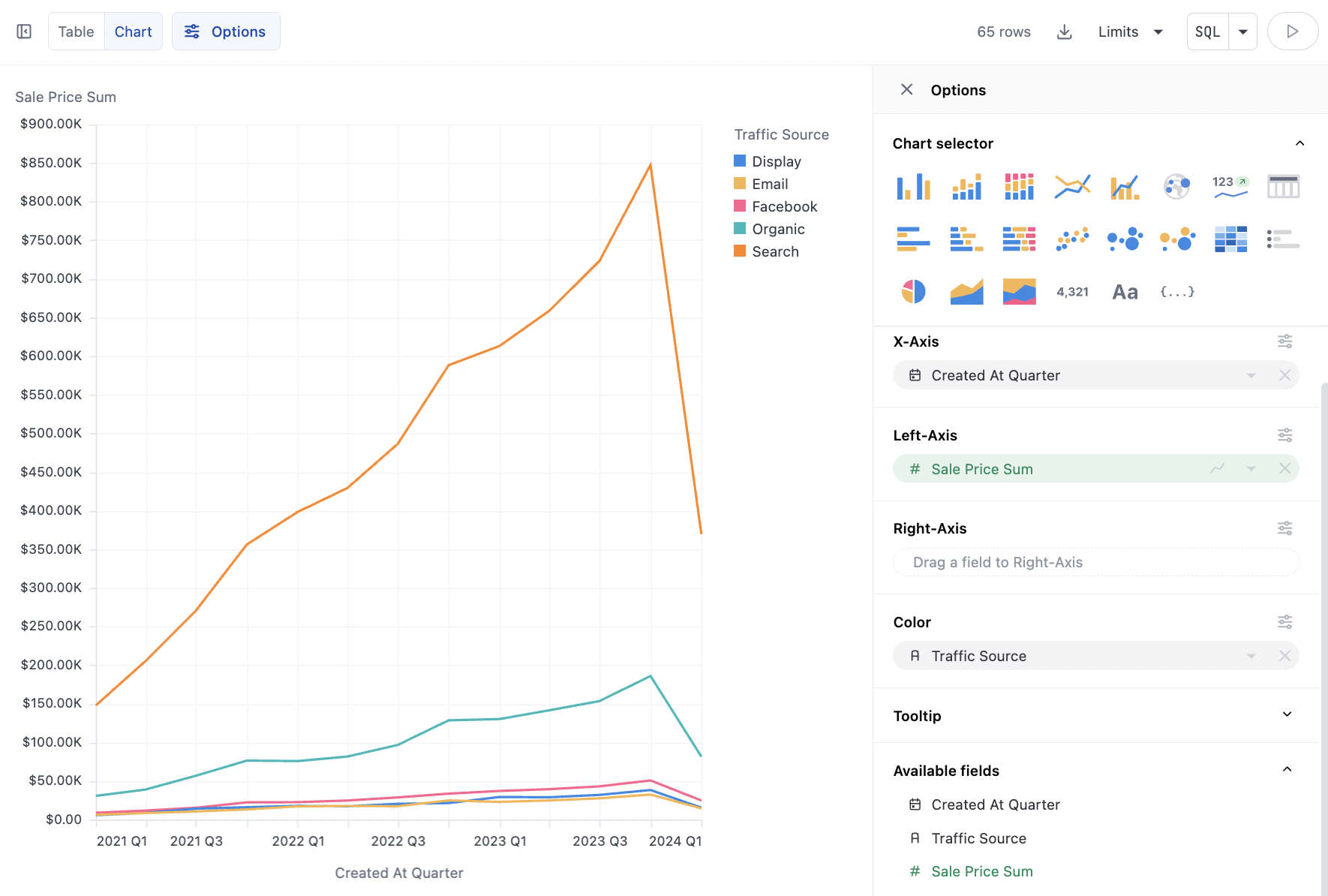 Fields can be used across more than one facet by dragging from available fields into the corresponding facet. Alternatively the fields can be moved by grabbing a token and changing the chart. Here are a few examples with our original query: