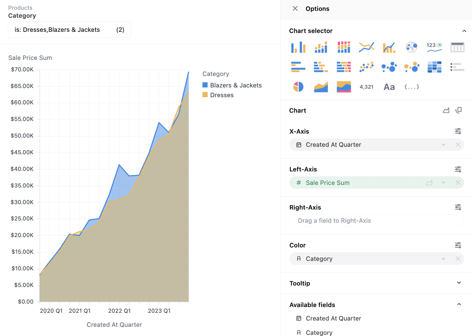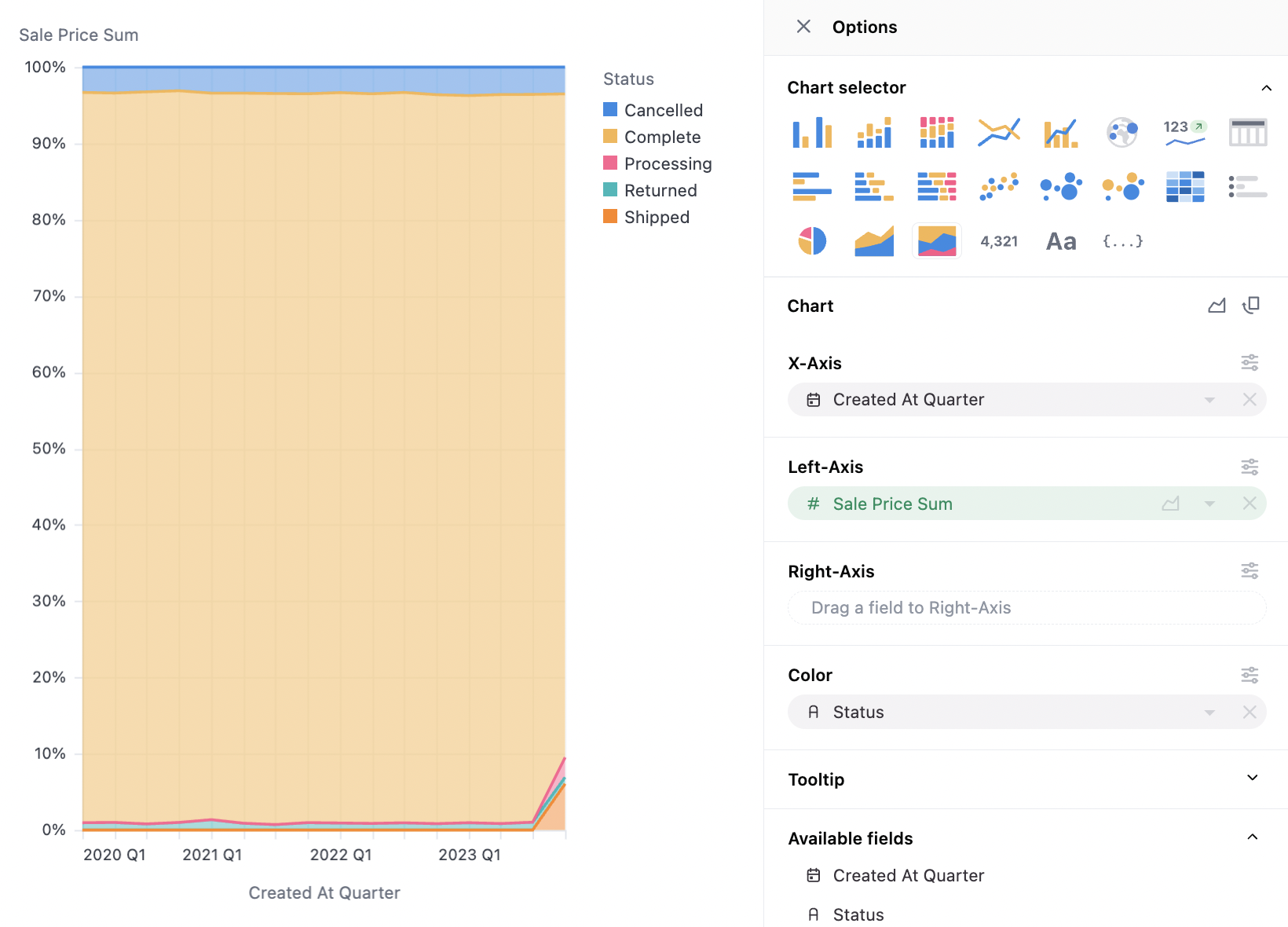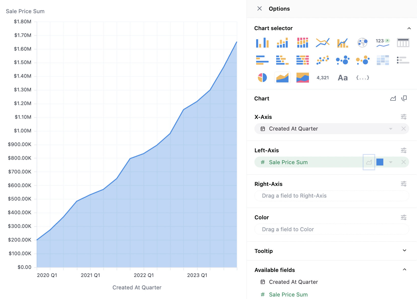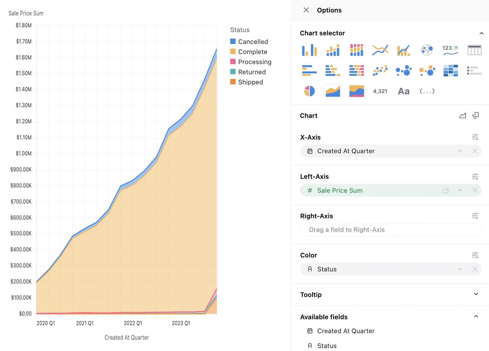 - Time dimension axes are set to temporal with area charts, meaning points will be displayed along a continuous time axis. For charts where ordinal behavior is desired, it’s recommended to toggle the individual series from a bar chart accelerator.
