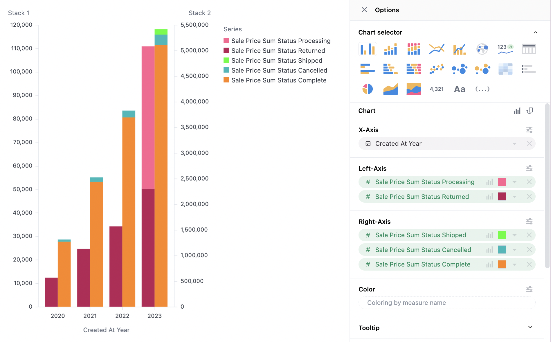 The color section controls overall stacking and grouping behavior overall. Additionally stack can be set independently on the different y-axis, under the y-axis series configuration (useful for overall grouping of two stacked grouplets):- Automatic: we’ll guess for you